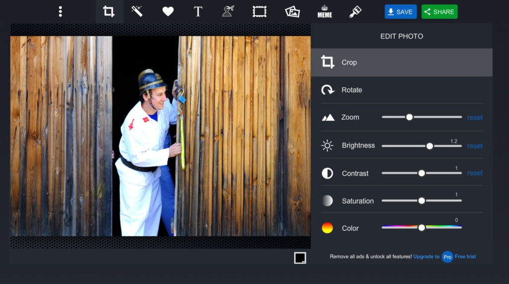 Nicméně: ve free verzi jsou přístupné ta opravdu klíčová šoupátka jako ořez, zmenšení velikosti, úpravy expozice, barev, zastření. Tedy přesně to, co se hodí. Navíc, na rozdíl o některých konkurenčních aplikací není nutná registrace. Prostě otevřete fotku a vše funguje.