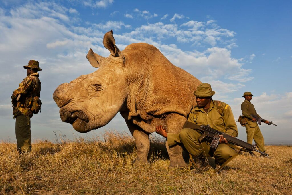 Mezi vystavenými snímky je i mnohokrát oceněný Jihoafričan Brent Stirton, jehož snímek posledního severního bílého nosorožce obklopeného strážci je asi nejznámějším dílem na výstavě. Zdroj: Canon.cz