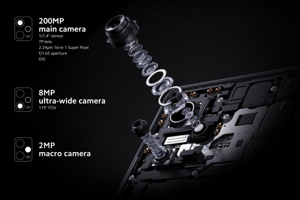 Hlavní širokoúhlý fotoaparát: 200 Mpx, 24mm, f/1.7, velikosti snímače 1/1.4″