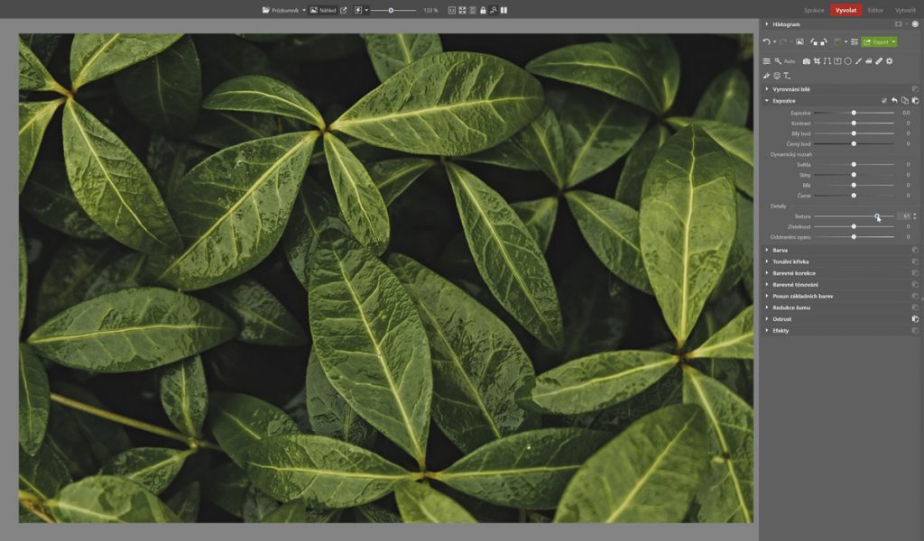 Nové parametry Bílé a Černé pracují s nejsvětlejšími a nejtmavšími tóny na fotce. Uživatel tak precizněji upraví třeba příliš tmavé pozadí, aniž by ovlivnil jiné tmavé plochy. Nová funkce Textura zvýrazní i ty nejjemnější detaily přidáním kontrastu. Skvěle se hodí třeba pro zdůraznění stébel trávy, ptačího peří nebo vzoru tkaniny.