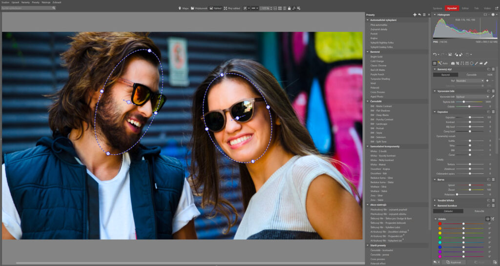V modulu Vyvolat rozpozná umělá inteligence tvář, oči a rty na fotce a navrhne jejich vylepšení pomocí kruhových filtrů. Výsledkem je jemné projasnění obličejů a zvýraznění detailů pro přirozený vzhled. Míru těchto úprav má fotograf po celou dobu pod kontrolou.
